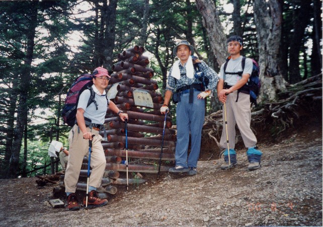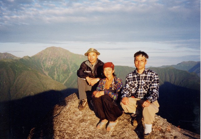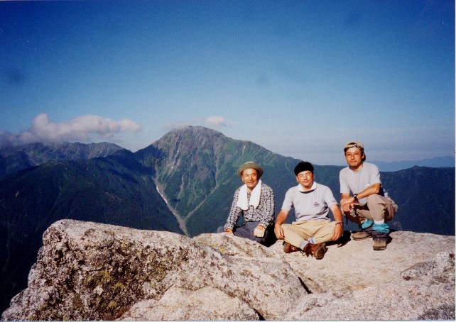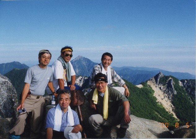 | 甲斐駒ヶ岳をバックに 観音岳山頂での記念写真です。(左端が私) 中央後ろに甲斐駒ヶ岳(かいこまがたけ 2,967m:24th)が顔をのぞかせています。 右は尖った岩塔オベリスクのある地蔵ヶ岳(じぞうがたけ 2,764m:75th)。 左奥がアサヨ峰(-みね 2,799m:65th)です。 | |