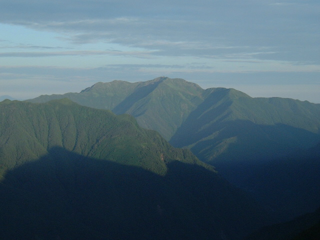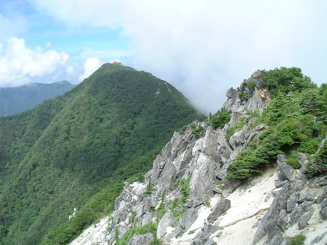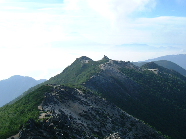 | 観音岳への稜線 観音岳(かんのんだけ 2,840m:50th)に続く稜線です。 中央の頂が観音岳です。 ・稜線(りょうせん)=峰と峰を結ぶ尾根の連なり,または単に尾根のこと | |