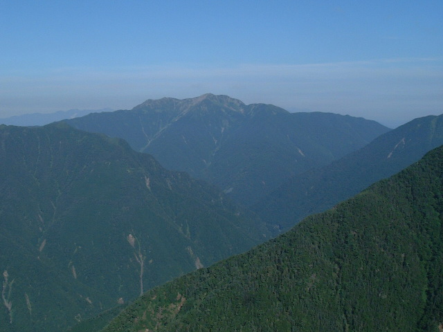 | 薬師岳 観音岳(かんのんだけ 2,840m:50th)から振り返った薬師岳(やくしだけ 2,780m:67th)へ続く稜線です。 中央やや左のピークが薬師岳山頂。 遠くにはうっすらと毛無山(けなしさん 1,964m)も見えています。 | |