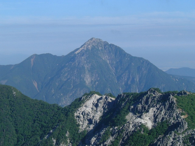 | 甲斐駒ヶ岳 甲斐駒ヶ岳(かいこまがたけ 2,967m:24th)の遠望です。 左端の頂が駒津峰(こまつみね 2,752m:81th)です。 | |