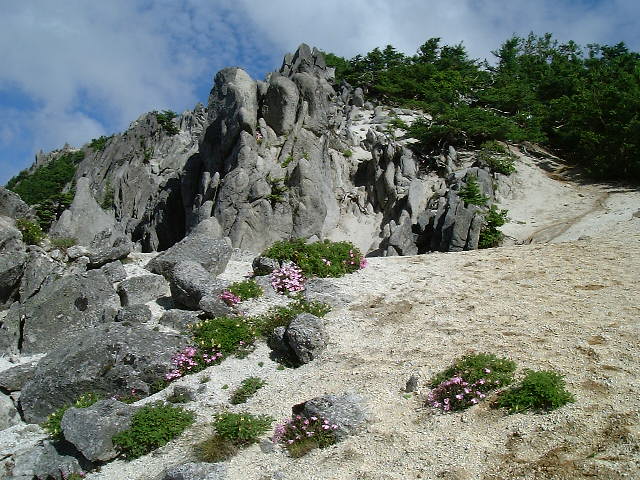 | タカネビランジ 稜線上の日当たりのよい砂地では,いたるところにタカネビランジが咲いています。 ・稜線(りょうせん)=峰と峰を結ぶ尾根の連なり,または単に尾根のこと | |