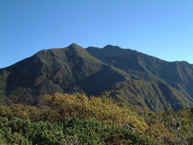 山頂下より見た摩利支天(まりしてん 2,820m)です。 右後方は高嶺(たかみね 2,779m:68th)です。 | |