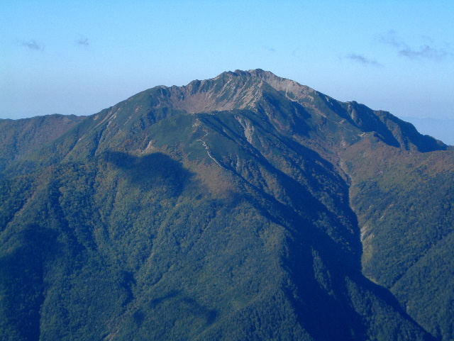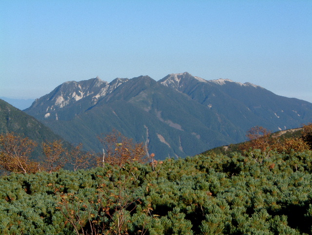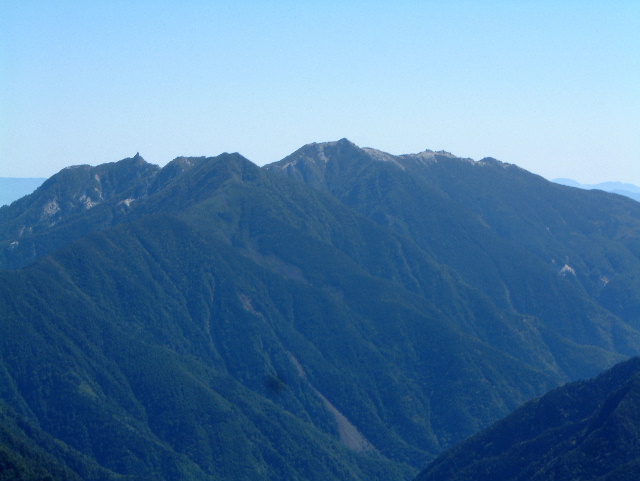 甲斐駒ヶ岳(かいこまがたけ 2,967m:24th)の山腹から見た仙丈ヶ岳(せんじょうがたけ 3,033m:17th,左)と駒津峰(こまつみね 2,752m:81th,手前の山の左端)です。 | |