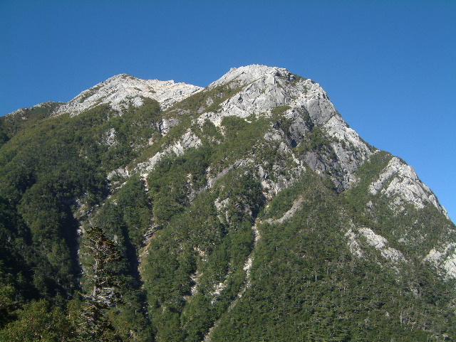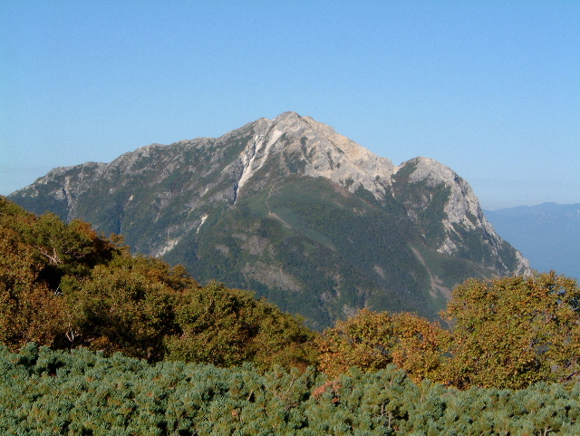 仙水峠(せんすいとうげ 2,264m)から見上げた甲斐駒ヶ岳(かいこまがたけ 2,967m:24th)です。 手前の摩利支天(まりしてん 2,820m)が大きく見えています。 | |