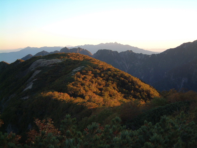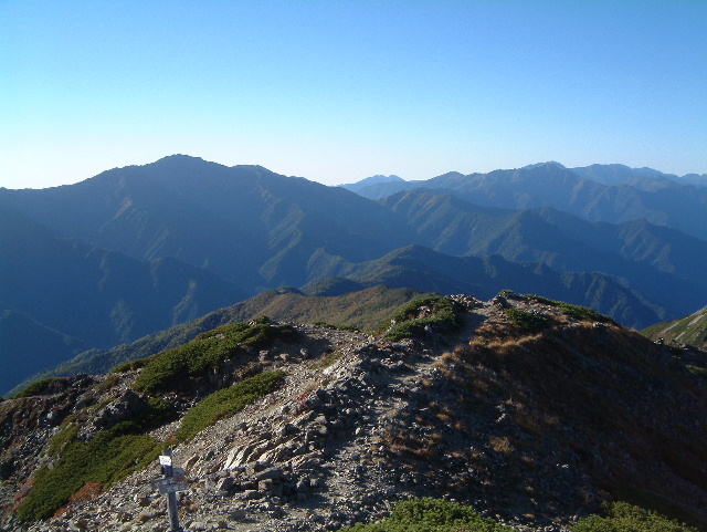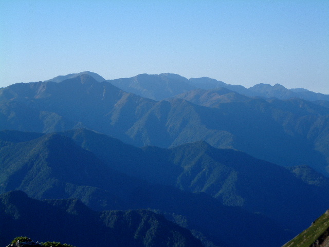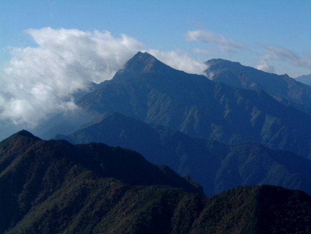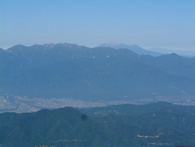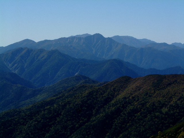中央に濃く見えるのが塩見岳(しおみだけ 3,047m:16th)。 その左に東岳(ひがしだけ=悪沢岳:わるさわだけ 3,141m:6th)。 右に赤石岳(あかいしだけ 3,120m:7th)が見えます。 左端の山は蝙蝠岳(こうもりだけ 2,865m:40th)です。 | |