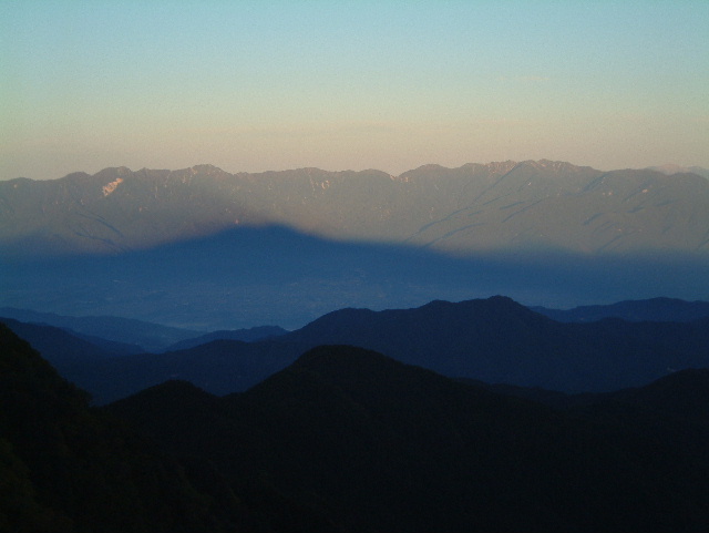 | 仙丈ヶ岳の影を落とした中央アルプスの山並み