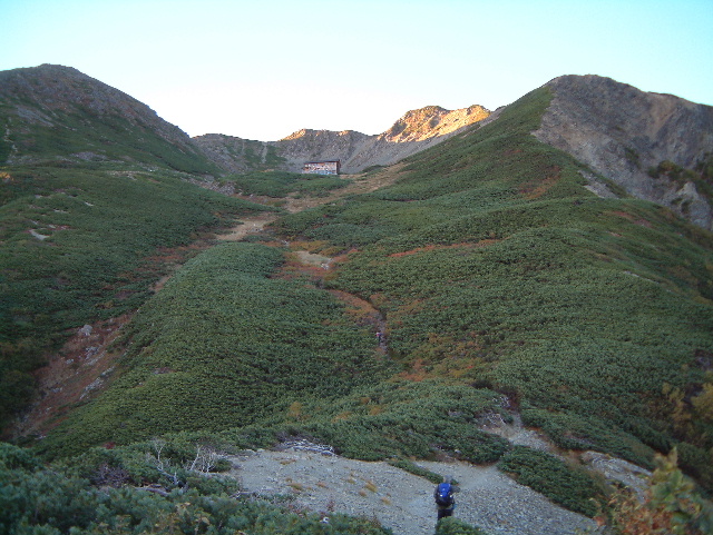 ハイマツに覆われた薮沢(やぶさわ)カールへの道です。 ・カール=氷河の浸食によって形成された半球状の窪地のこと | |