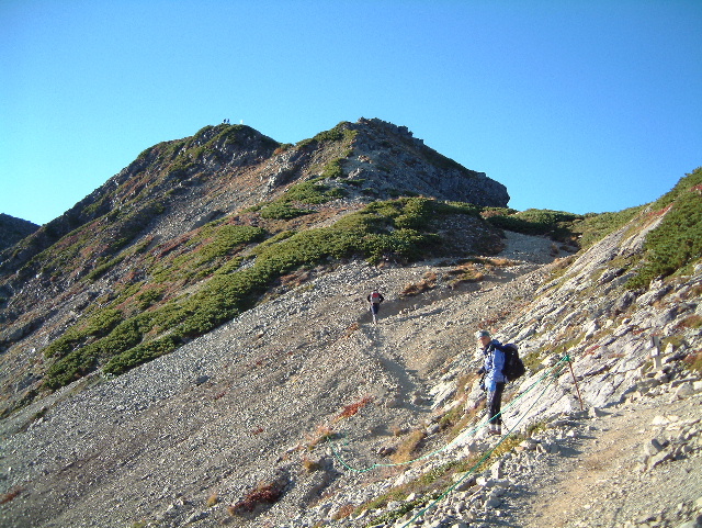 稜線上は足場の悪い岩場の道です。 右前方が駒津峰です。 ・稜線(りょうせん)=峰と峰を結ぶ尾根の連なり,または単に尾根のこと | |