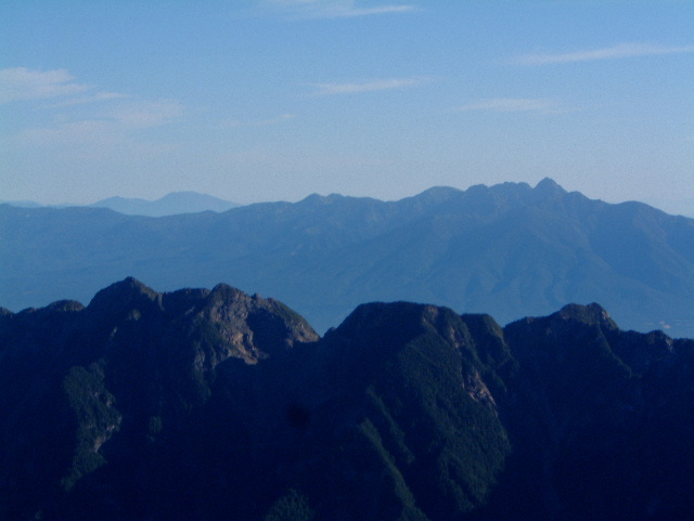 手前の鋸山(のこぎりやま=鋸岳:のこぎりだけ 2,685m:94th)の向こうに見えるのが八ヶ岳(やつがたけ 右端の尖ったところが最高峰の赤岳 あかだけ 2,899m:33th)。 その左奥にうっすら見えているのが浅間山(あさまやま 2,568m:136th)です。 | |