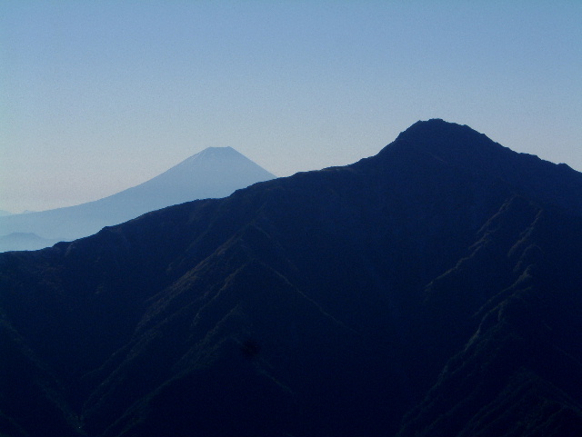 陽が高くなり険しい山容がはっきりしてきた北岳(3,192m:2nd)。 その左には山頂の白い雪がうっすらと輝く富士山が見えています。 | |
