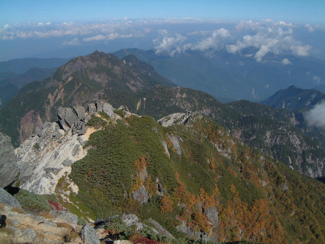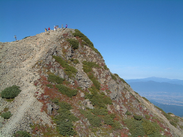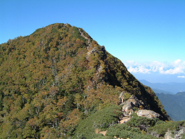 鋸山(のこぎりやま=鋸岳:のこぎりだけ 2,685m:94th)に続く稜線です。 ・稜線(りょうせん)=峰と峰を結ぶ尾根の連なり,または単に尾根のこと | |