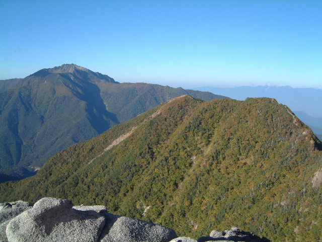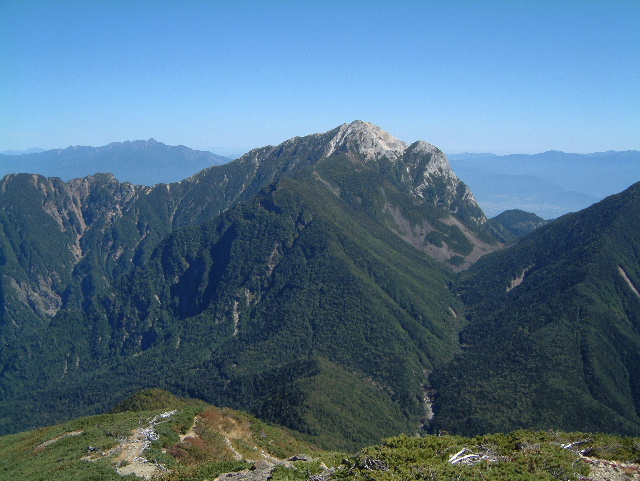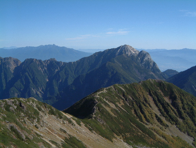 中央にそびえているのが甲斐駒ヶ岳(かいこまがたけ 2,967m:24th)。 左奥には八ヶ岳が見えています。 手前右のピークが小仙丈ヶ岳(2,864m)です。 | |