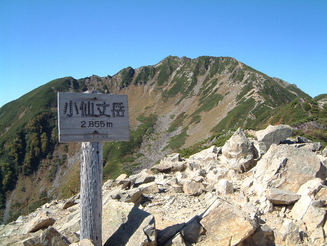 駒津峰(こまつみね 2,752m:81th)山頂です。 後ろに見えているのは鋸山(のこぎりやま=鋸岳:のこぎりだけ 2,685m:94th)です。 | |