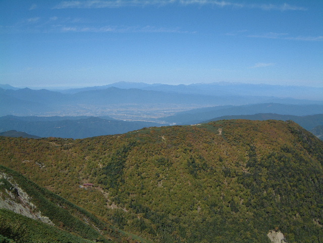 小仙丈ヶ岳(こせんじょうがたけ 2,864m)から見た馬ノ背(うまのせ)。 左下の山腹に馬ノ背ヒュッテが見えています。 遠くに見えているのが北アルプスの山並み。 中央やや左が乗鞍岳(のりくらだけ 3,026m:19th)です。 | |
