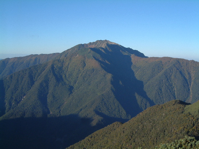 山頂から望む仙丈ヶ岳(せんじょうがたけ 3,033m:17th)です。 南アルプスの女王といわれるだけあって,たおやかな山容です。 左のくぼみが小仙丈カール(こせんじょう-)。 右下に続く谷が薮沢(やぶさわ)です。 ・カール=氷河の浸食によって形成された半球状の窪地のこと | |