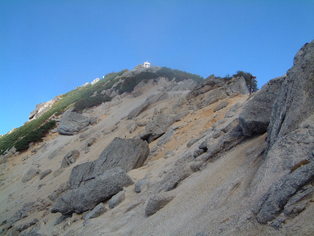 真っ白い花崗岩の岩と砂に覆われた斜面です。 真下に見えているのが仙水峠(せんすいとうげ 2,264m)です。 | |