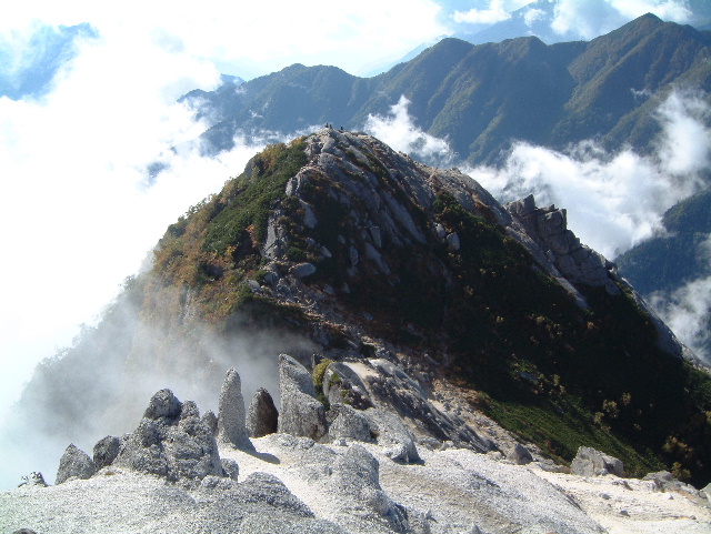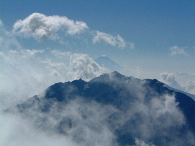 霧の中から顔を出した笠雲をかぶった富士山(3,776m:1st)と鳳凰三山(ほうおうさんざん)です。 中央が観音岳(かんのんだけ 2,840m:50th)。 その左の尖った岩塔オベリスクがあるのが地蔵ヶ岳(じぞうがたけ 2,764m:75th)です。 | |