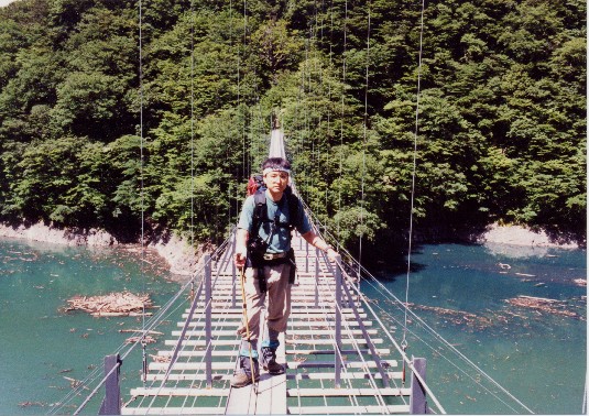 畑薙第1ダム(はたなぎだいいち-)のダム湖にかかる畑薙大吊り橋(950m)です。 東洋一とも言われ,長さ182m,湖面からの高さは約30mあります。 | |