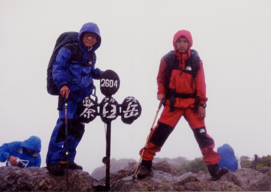 最初の目的地,茶臼岳(ちゃうすだけ 2,604m:121th)山頂です。 あいにくの天気でした。 | |