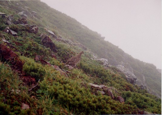 中央やや左にライチョウがいます。 ライチョウを見かけると天気が崩れると言われています。 | |