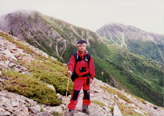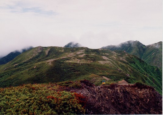 | 荒川中岳の山頂にて 4日目の宿泊地,荒川中岳(あらかわなかだけ 3,083m:13th)に到着です。 小屋は少し下ったところに建っています。 | |