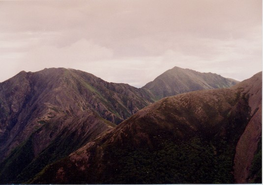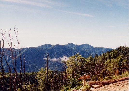 荒川三山 馬ノ背から見た荒川三山(あらかわさんざん)です。 左が荒川岳(あらかわだけ 最高峰は中岳 なかだけ 3,083m:13th 手前が前岳 まえだけ3,068m)。 右が東岳(ひがしだけ=悪沢岳:わるさわだけ 3,141m:6th)です。 | |