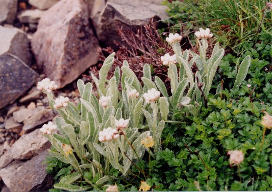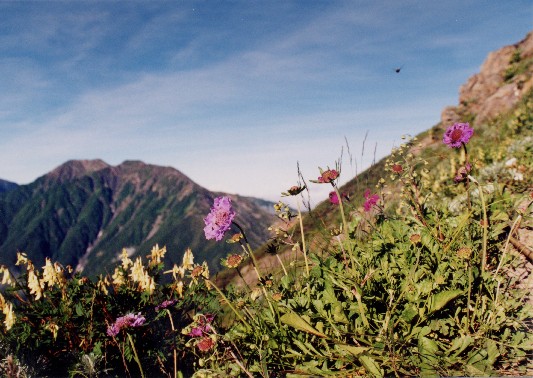 | タカネマツムシソウ 紫色の花がタカネマツムシソウです。 左下のクリーム色の花はイワオウギです。 後方は赤石岳。 | |