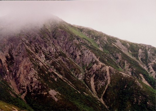 | 荒川岳の登山道 荒川岳の山腹には筋のように登山道が見えます。 左下から右に向かって斜めに進み,画面中央から真っ直ぐ上に続いています。 中央上の緑の部分が次のページ以降に載せているお花畑です。 | |