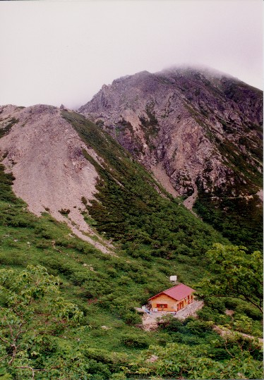| 荒川岳と荒川小屋 右が荒川岳(あらかわだけ 最高峰は中岳 なかだけ 3,083m:13th)の前岳(まえだけ 3,068m)です。 右下の建物は荒川小屋(あらかわごや 2,608m)です。 | |