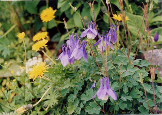 | ミヤマオダマキ 一株だけ見つけたミヤマオダマキです。(紫) その左にはシロウマタンポポも咲いています。 | |