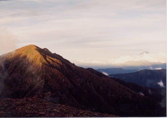 | 東岳と富士山 荒川中岳避難小屋から見た夕日に染まる東岳(ひがしだけ=悪沢岳:わるさわだけ 3,141m:6th)です。 右端に遠く富士山も見えます。 | |