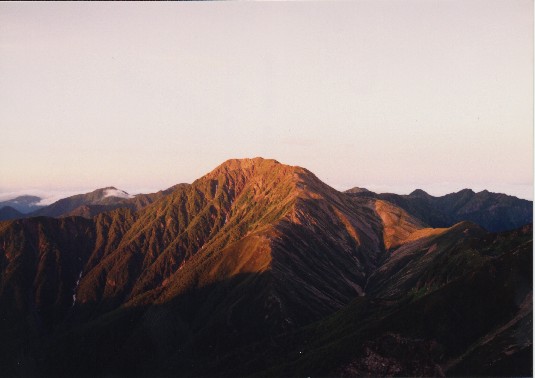 | 朝焼けの赤石岳 東岳への途中から見た朝焼けに輝く赤石岳(あかいしだけ 3,120m:7th)です。 | |