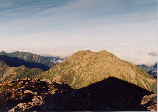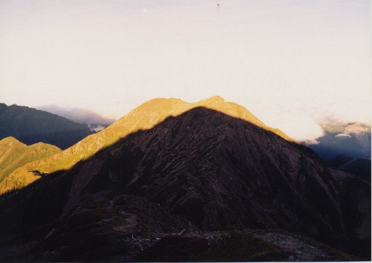 | 影を落とす東岳 荒川岳(あらかわだけ 右が最高峰の中岳 なかだけ 3,083m:13th 左が前岳 まえだけ3,068m)に映った東岳の影です。 | |