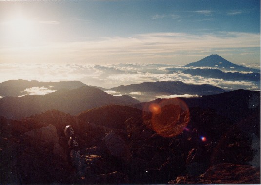 | 朝日と富士山 東岳(ひがしだけ=悪沢岳:わるさわだけ 3,141m:6th)山頂から見た朝日と富士山です。 | |