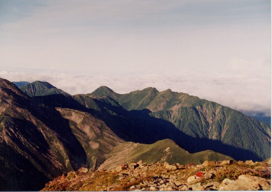 | 小河内岳と中央アルプス 荒川岳から塩見岳へ続く稜線です 中央が小河内岳(こごうちだけ 2,802m:64th)。 左,雲海の向こうに中央アルプスの山並みが見えています。 ・稜線(りょうせん)=峰と峰を結ぶ尾根の連なり,または単に尾根のこと | |