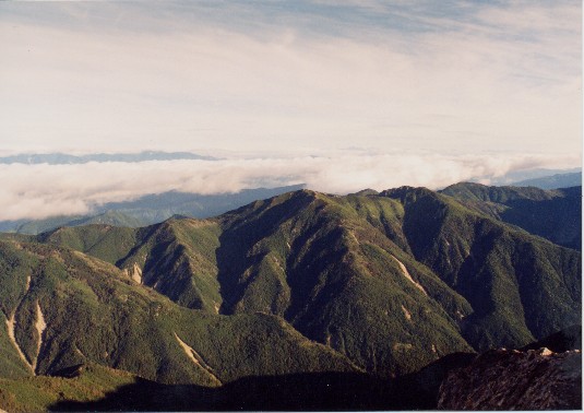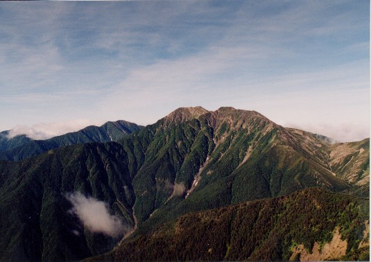 | 赤石岳 赤茶けて見えるのが赤石岳(あかいしだけ 3,120m:7th)。 赤石岳の左に半分隠れているのが聖岳(ひじりだけ 3,013m:21th)です。 その左,山腹に雲をまとっているのが上河内岳(かみこうちだけ 2,803m:63th)。 右端に小さく見えているのが兎岳(うさぎだけ 2,818m:56th)です。 | |