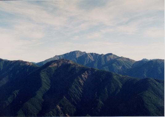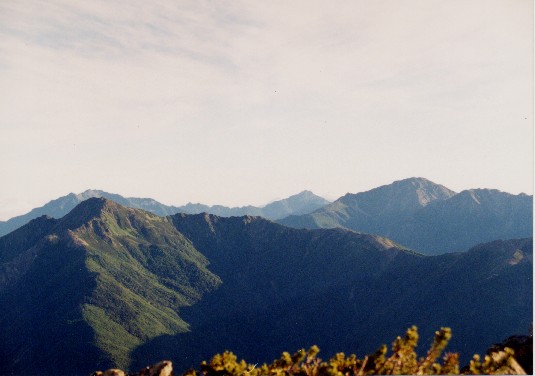| 赤石岳と聖岳 中央の赤茶けた山が赤石岳(あかいしだけ 3,120m:7th)です。 左のコブの右端が山頂で,右のコブは小赤石岳(こあかいしだけ 3,081m)です。 赤石岳の左が聖岳(ひじりだけ 3,013m:21th)。 その左の雲に隠れているのが上河内岳(かみこうちだけ 2,803m:63th)です。 | |
