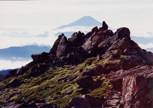 | 東岳の岩場と富士山 東岳山頂のやや東よりにある岩を積み上げたような場所です。 | |