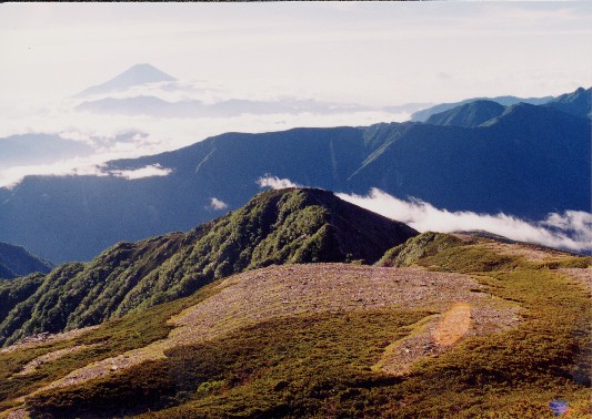 | 千枚岳と富士山 丸山(まるやま 3,032m)から見た千枚岳(せんまいだけ 2,880m=画面中央)です。 画面右端に2こぶラクダのような笊ヶ岳((ざるがたけ 2,629m:111th)が半分見えています。 そこから左下に続くのが白峰南嶺(しらねなんれい)の山並みです。 | |