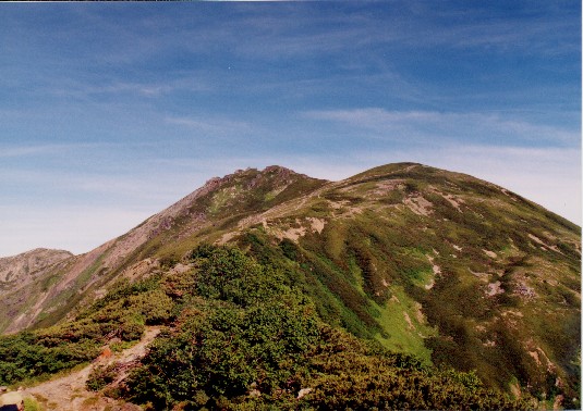 兎岳からの道の途中で見上げた中盛丸山(なかもりまるやま 2,807m:61th)です。 正面の岩場をまっすぐに登っていきます。 | |